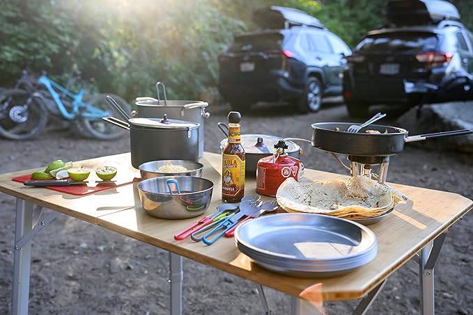 Love the lightweight design of this camping stove. It’s perfect for backpacking and cooks food quickly and evenly.