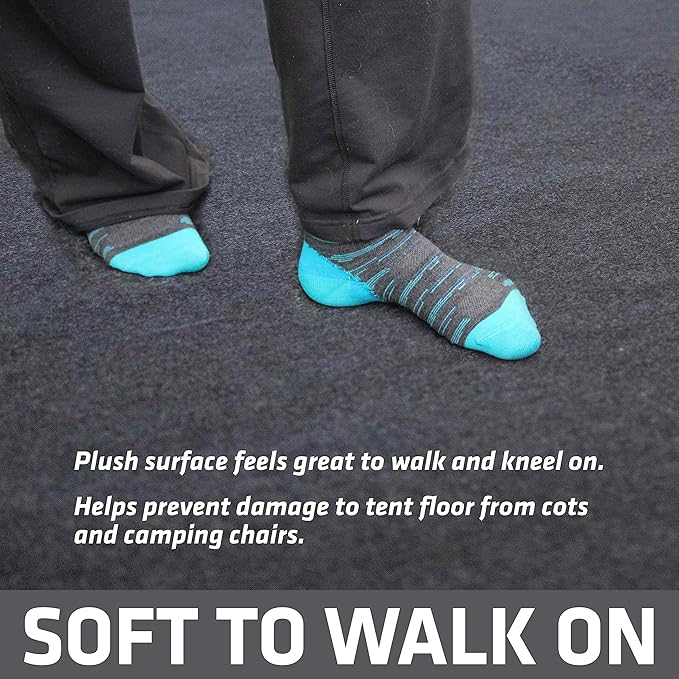 - CARPET LIKE MATERIAL, SOFT & COMFORTABLE: This mat transforms the inside of your tent by adding a cozy carpet/rug like material. This is soft to walk and sleep on, providing you with added comfort. This mat also helps prevent damage to your tent floor from cots and camping chairs.