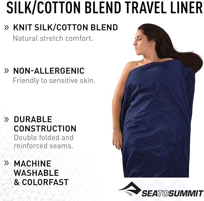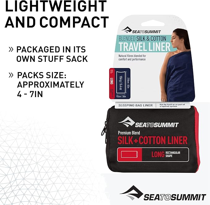 - Lightweight and compact silk-cotton blend sleeping bag liner for backpacking, camping, and travel