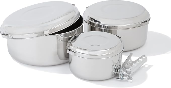 - Includes 1L pot, 2L pot, 3L pot, 3 lids/plates, PanHandler pot handle, and stuff sack