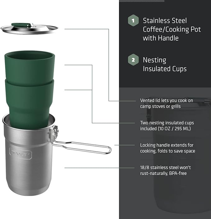 - IDEAL OUTDOOR ACCESSORIES: The Stanley cook kit is perfect for outdoor cooking for hot meals, coffee, or boiling water Our cooking pots come with a vented top to let steam escape or strain liquid This is a great survival supplies gift too
