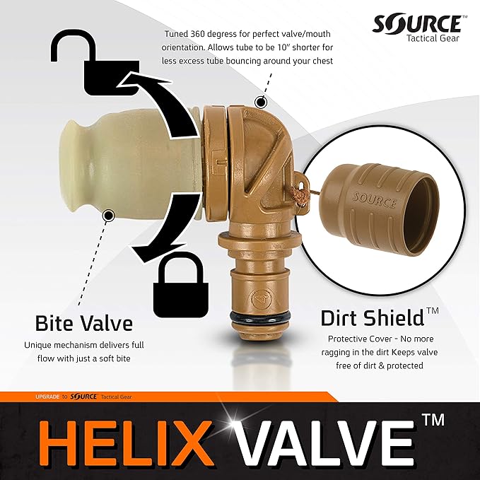 - Helix Bite Valve: provides high water flow with just a soft bite at any angle; sophisticated spring sealing mechanism prevents leaking even under high pressure.