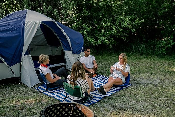 - OUTDOOR CAMPING MAT: This area mat can be placed on the floor to protect furniture like chairs, tents, tables, etc. The blue and white stripes will add some decor to your camp. It can also be used at home to act as a carpet for your patio or balcony.