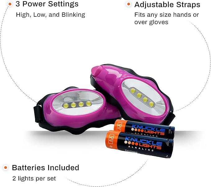 - LIGHTWEIGHT COMFORT - Knuckle Lights night lights slide comfortably onto your hands with adjustable soft straps, fitting hands of all sizes, even over gloves. At less than 3 ounces each, they won't distract you from your activity.