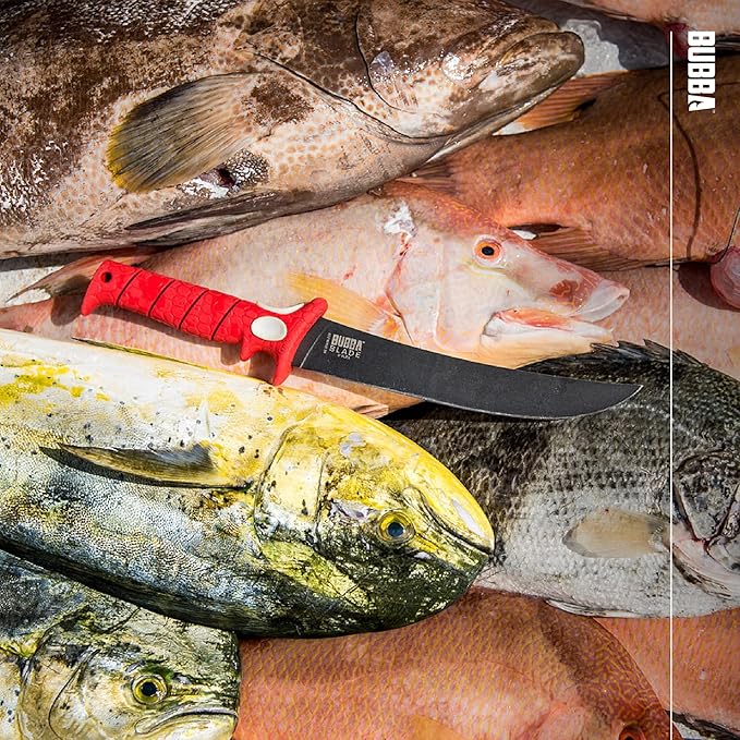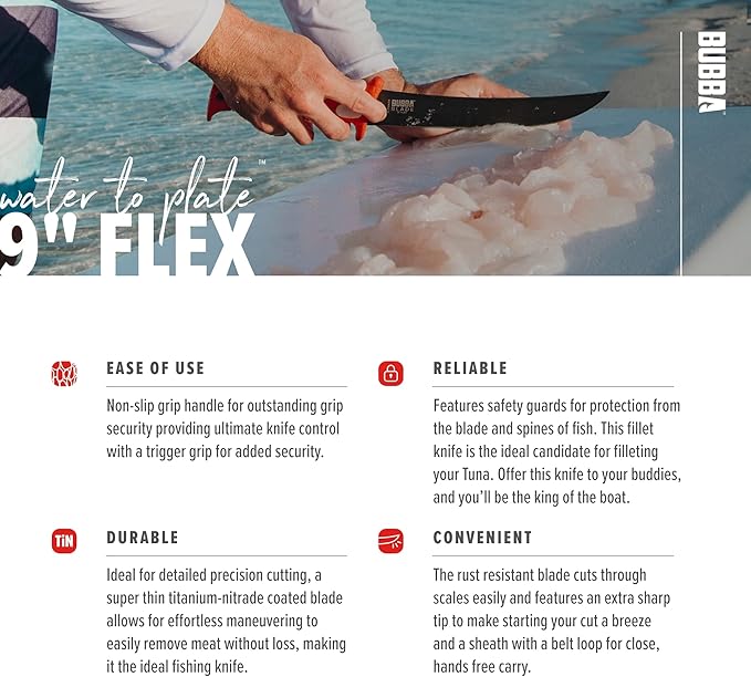BUBBA 9 Inch Flex Fillet Knife with Non-Slip Grip Handle, Full Tang Stainless Steel Titanium Bonded Blade, Lanyard Hole and Synthetic Sheath for Fishing