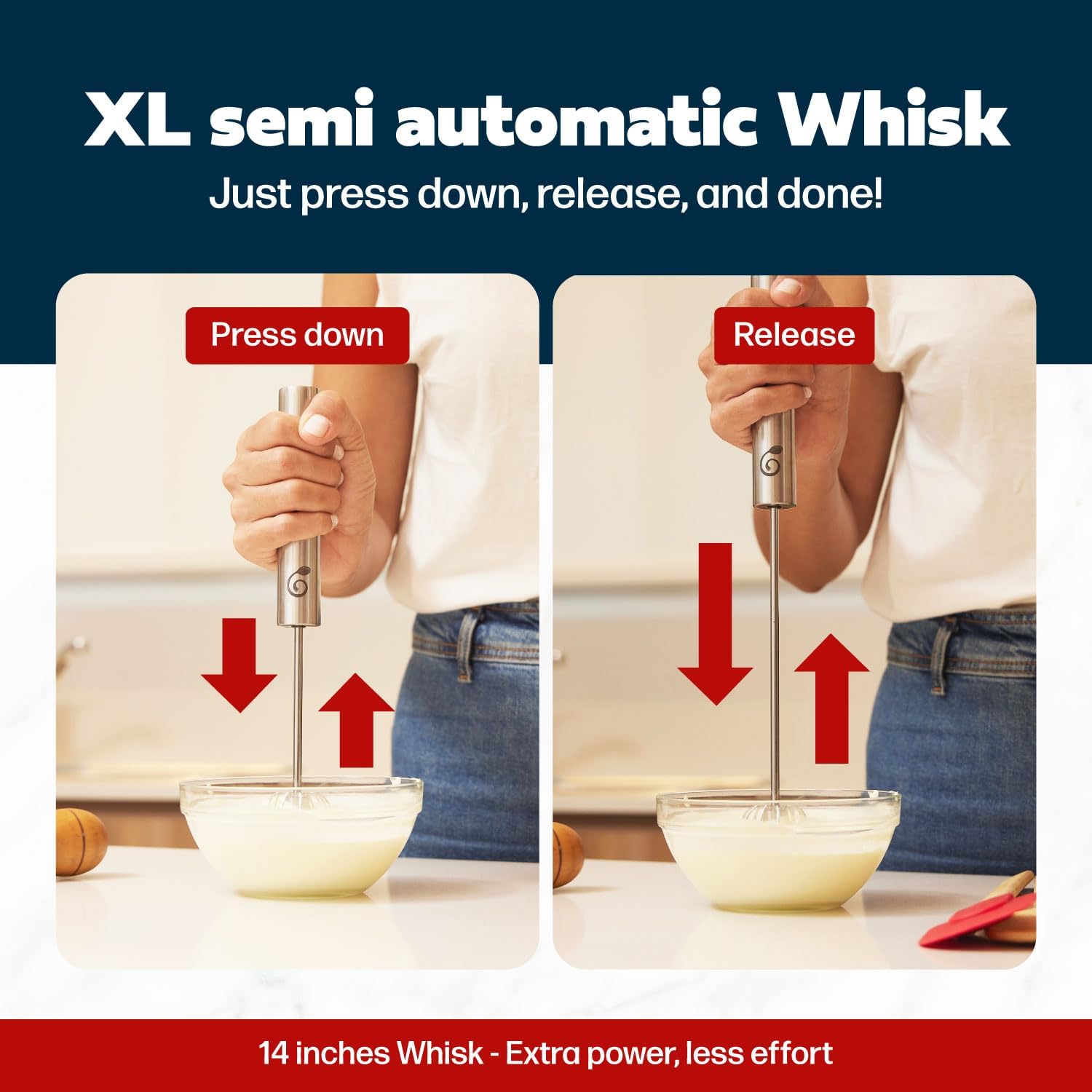 - QUICK AND EASY: Our stainless steel semi-automatic whisk is super fast and ultra-easy to use. To rotate the head on our easy whisk, simply push down and release up. Both of these actions will rotate our semi automatic whisk clockwise and then counterclockwise.