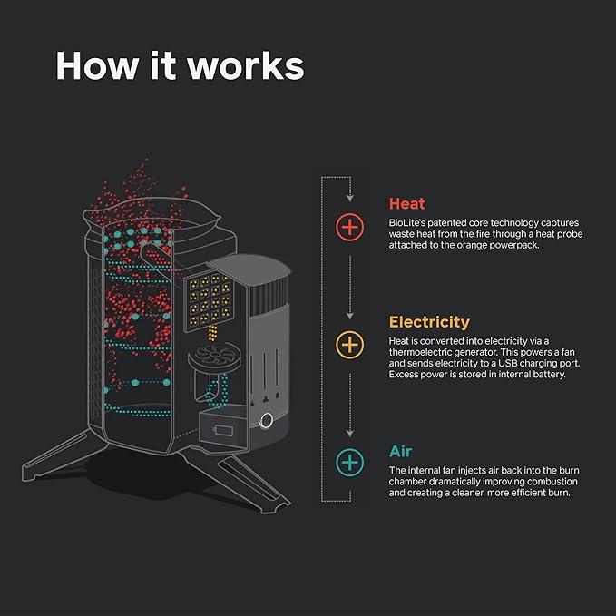 - Devices can be charged via the integrated USB port; thermoelectric generator generates 3 watts of power for real-time charging, and stores power in the 3,200 mAh battery for use even when fire isn’t burning