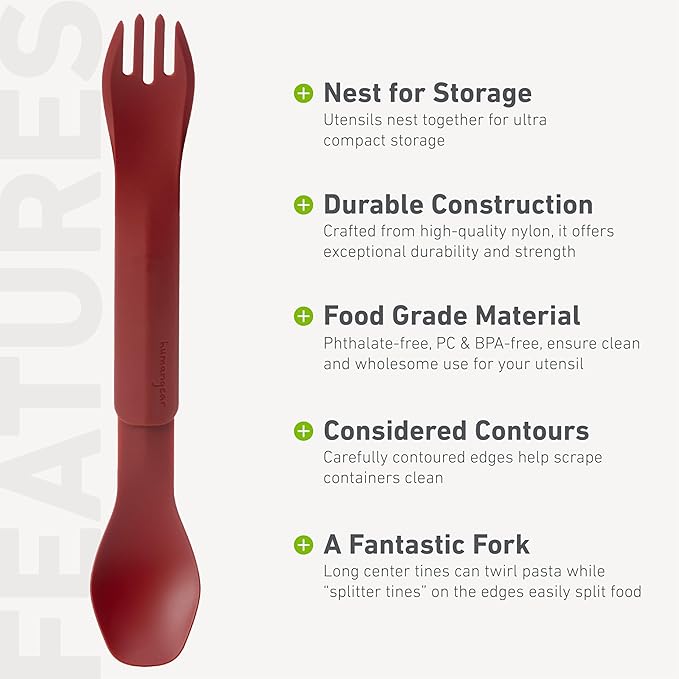- Evolved Design - Connect spoon and fork end-to-end to reach dehydrated food bags or extra deep containers, plus utensils nest together for ultra compact storage