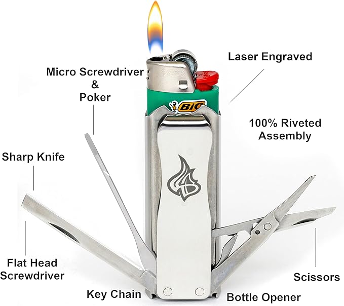 - TRANSFORM YOUR LIGHTER INTO A MULTITOOL MASTERPIECE: Our durable and reusable metal lighter case is made from 100% 420 stainless steel, heat-treated, and nearly indestructible. Features 7 tools plus fire in 1 multitool: knife, poker, scissors, bottle opener, two screwdrivers, key ring.