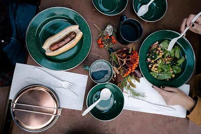 - ADD TO YOUR CAMPSITE: Set the perfect table with your favorite camp equipment. Add this camping enamelware to your supplies alongside your sleeping bag, pots and pans, cooler, travel stove, plastic fold tables, and any other cookware for your trip