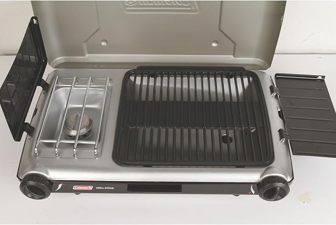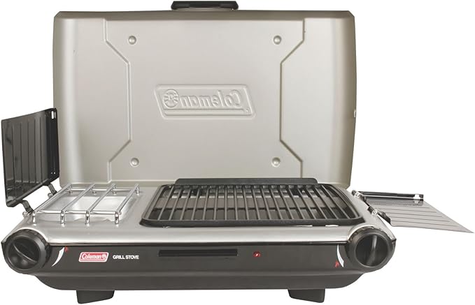 Coleman Tabletop 2-in-1 Grill & Stove with 2 Adjustable Burners, Propane Grill/Stove with Push-Button Starter, Wind Guards, Grease Tray, & 20,000 BTUs of Power for Camping, Tailgating, & More
