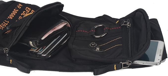 - MULTI COMPARTMENTS. New Moon shape with many pockets for storage and organization. Main compartment fits iPad/tablets and medium camera perfectly. Front pockets for phone, wallets,gear and small accessories. Back pocket for pen, small notebooks. Also including points to clip carabiners.