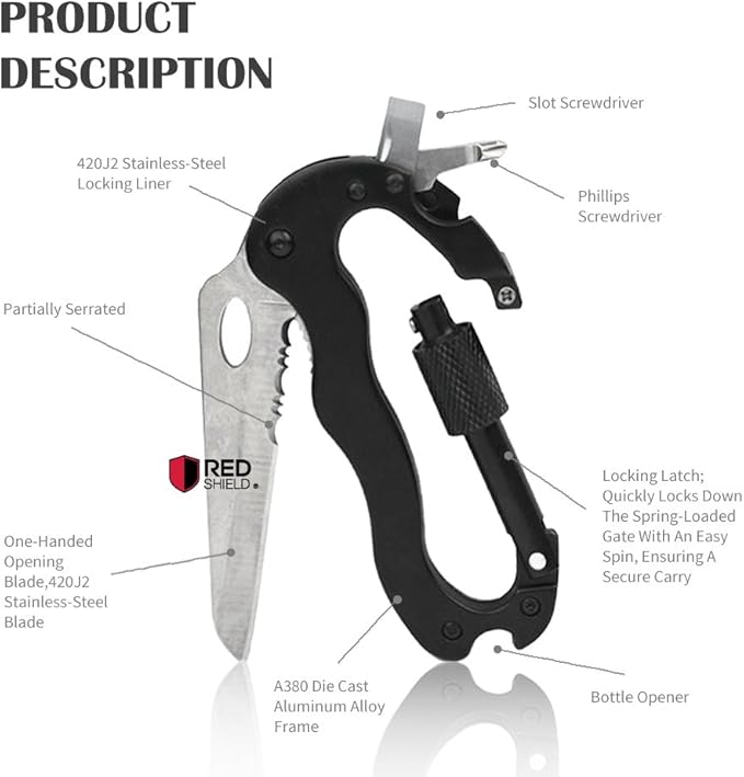 - 5-in-1 MULTITOOL: 5 in 1 carabiner survival tool is conveniently portable which includes Phillips & slotted screwdriver, bottle opener, stainless steel knife, and an aluminum alloy frame carabiner. The blade has partially serrated edges with plain edges.