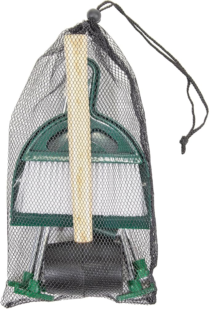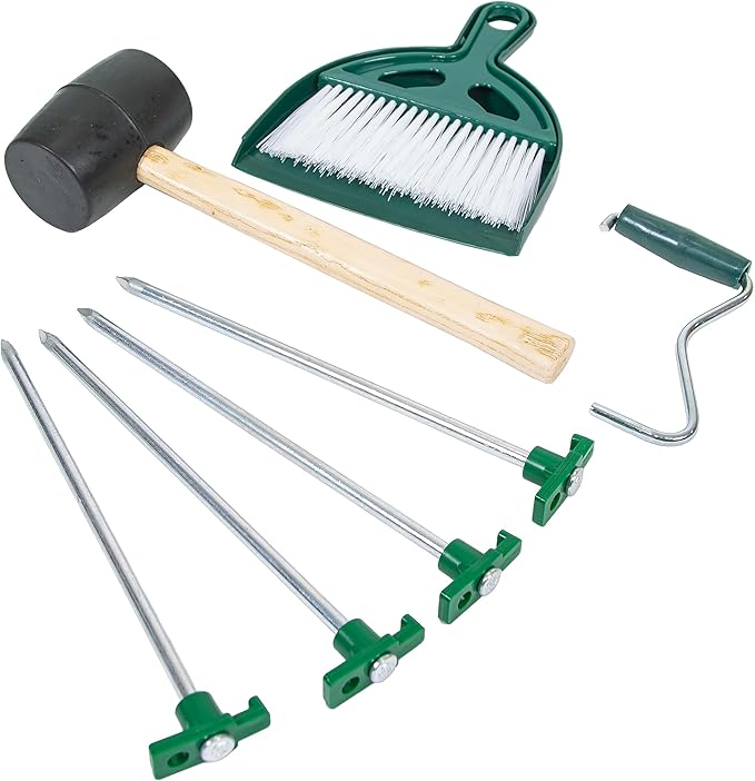 - Set includes: Whisk Broom, Dust Pan, Stake Puller, Rubber Mallet, Nail Stakes with T-top (4), and Mesh bag