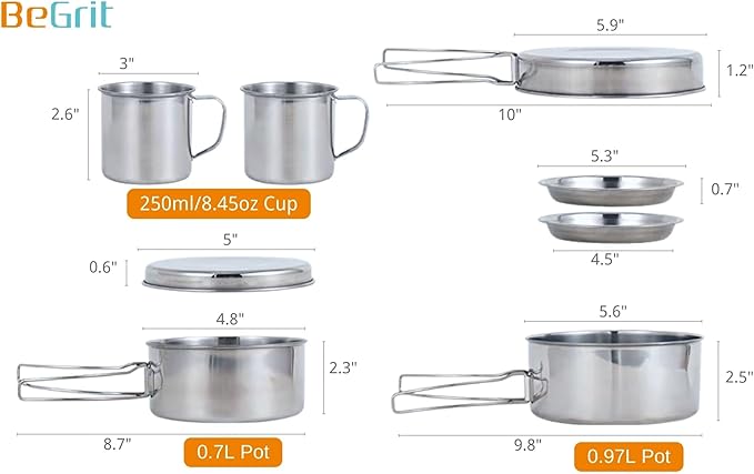 - 【Built To Last and Easy Clean】BeGrit Camping pot set heat quickly and is survival gear that is built to last. 410 stainless steel material, make it easy to clean and more durable.