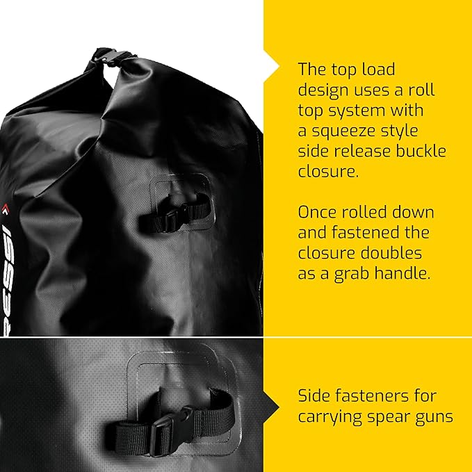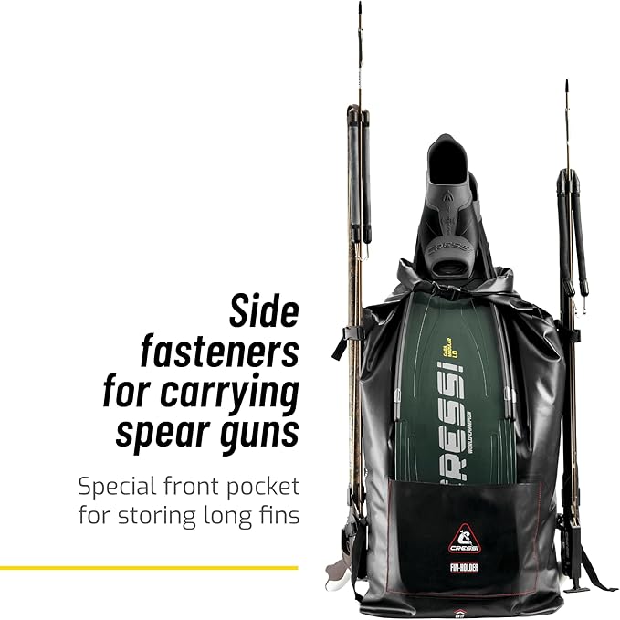 - Special front pocket for storing long fins as free diving fins like the Cressi Gara; Side fasteners for carrying spear guns