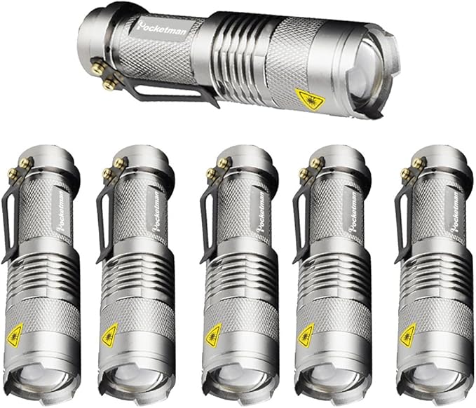 6 Pack,Pocketman 7W 300LM 3 Modes Mini Light Silver LED Tactical Flashlight