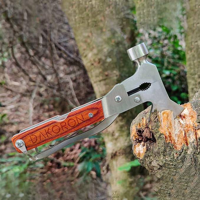 Multitool Hammer Camping Gear Accessories Survival Kits 14 in 1 Multifunction Tool Portable Folding Wood Handle Stainless Steel Multipurpose Equipment For Outdoor Hiking Hunting Tactic Unique Gifts