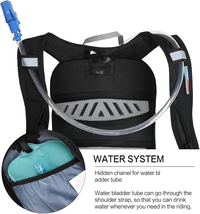 - EASY DRINKING SYSTEM: This cycling backpack adopts a system to drink water easily. On the shoulder straps of this cycling backpack, there is an opening to exit the hose, you can drink water easily during cycling. There are also mesh side pockets to put your water bottle. (NOTE: WATER BLADDER IS NOT INCLUDED)