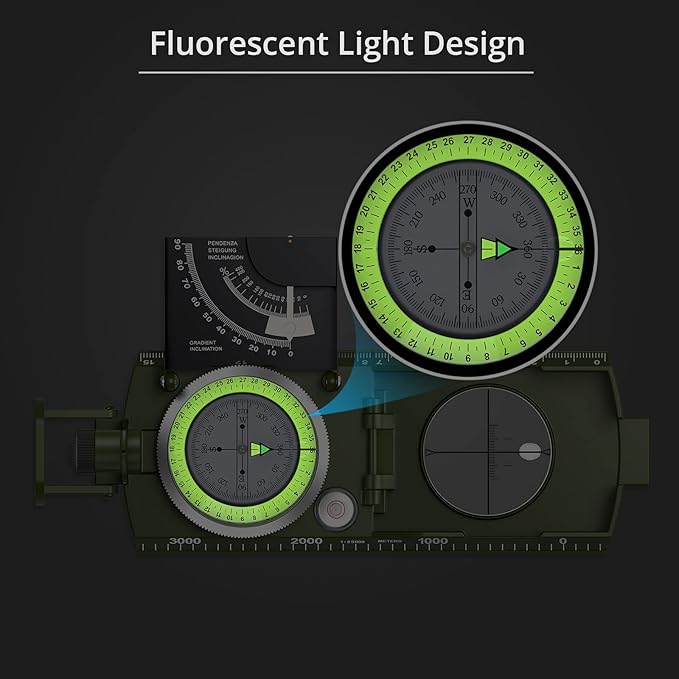 - Military Navigation Compass with Fluorescent: Luminous magnet arrow and compass card allows you to read data in dark environment after absorbing enough sunshine. The luminous effect is really convenient to use at night
