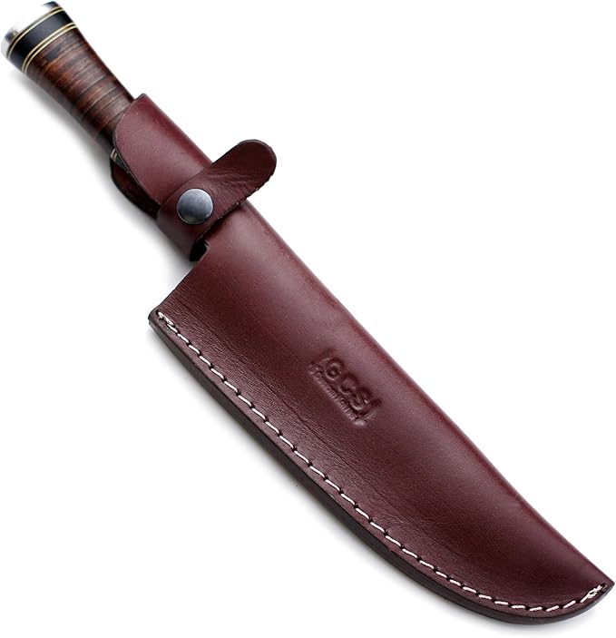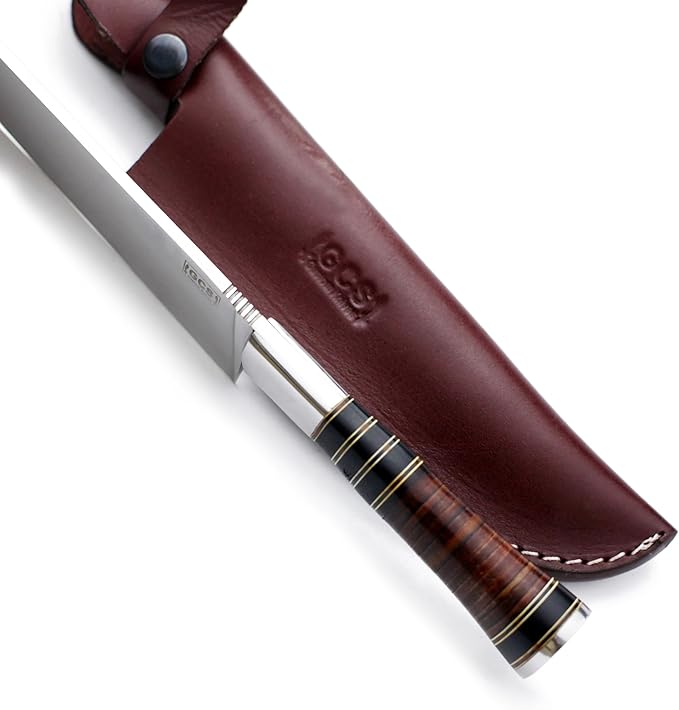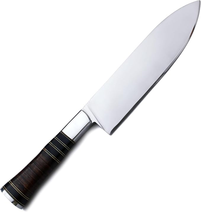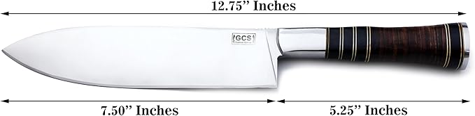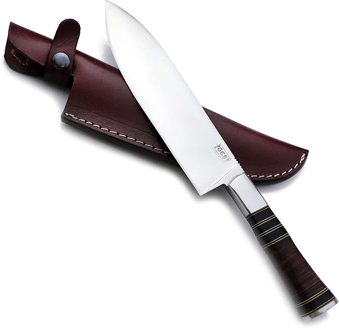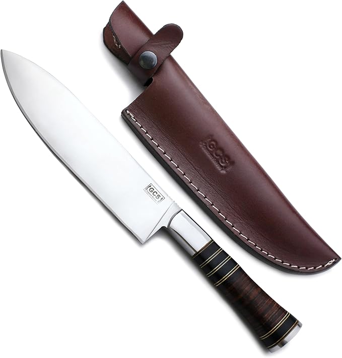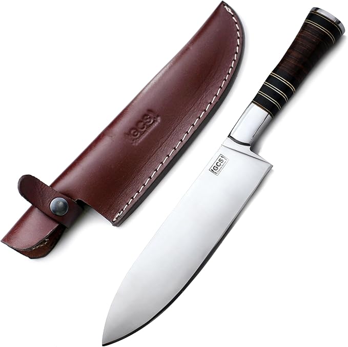 GCS Handmade Stacked Leather Handle D2 Tool Steel Chef Knife with leather Buffalo Hide Sheath 130
