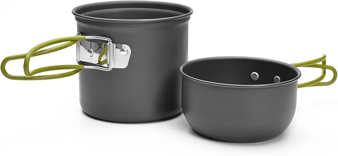 - Best Money Ever Spent: The 9 pieces camping cookware kit includes 1 mini stove + 2 aluminum non-stick pots + 1 spoon + 1 fork + 1 knife + 1 stainless steel cup (16oz) + 1 sillicone insulated cup protector + 2 Carry bag.