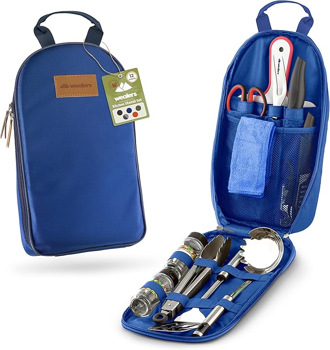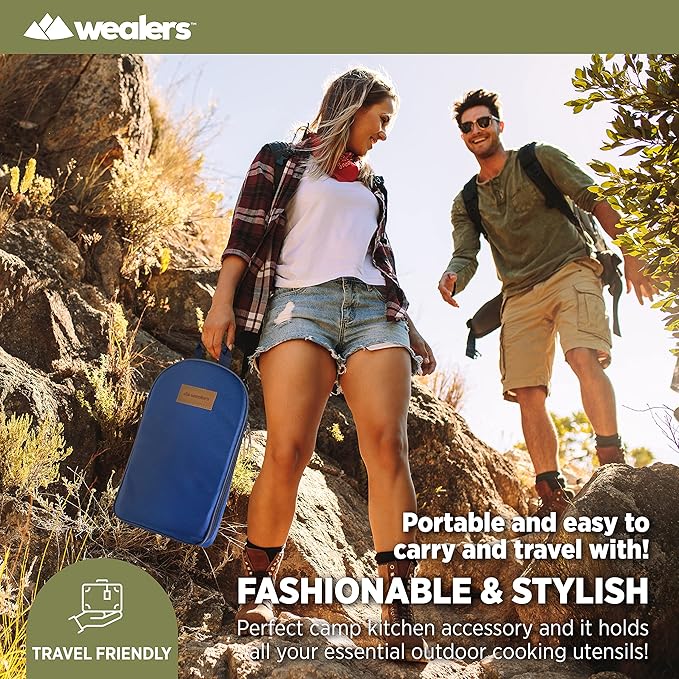 - MULTIPURPOSE: The trendy kit can be used for multiple applications, perfect for concerts, sporting events, hiking, boat rides, mountaineering and BBQ’s. The weather retardant the travel utensil kit is the perfect camp kitchen accessory, and it holds all your essential outdoor cooking utensils.
