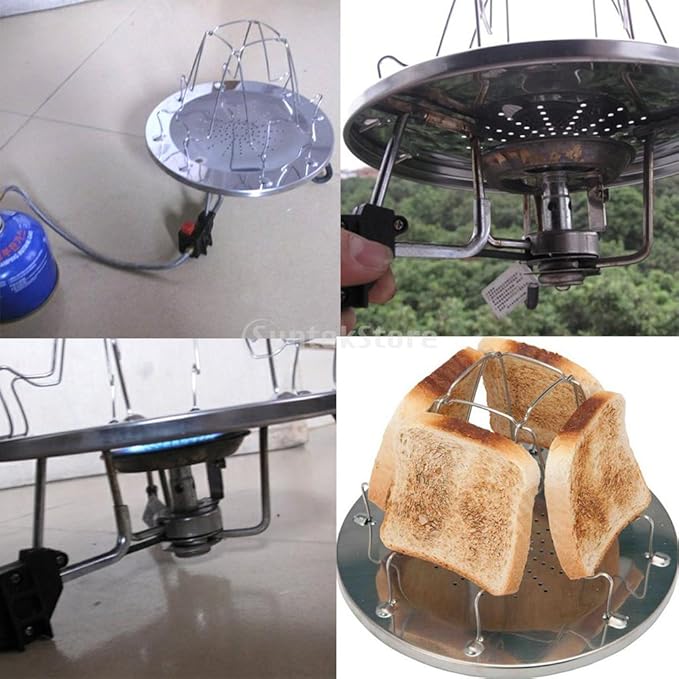 - Camping toaster for stove: Fits easily on any camp stove. Put in up to four pieces of bread at a time. When you're done, the toaster folds for easy, compact storage.