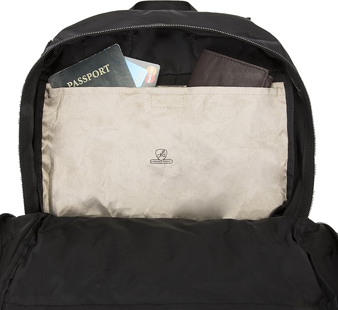 - Locking main compartment with RFID blocking interior pocket, padded straps are secured at back panel.