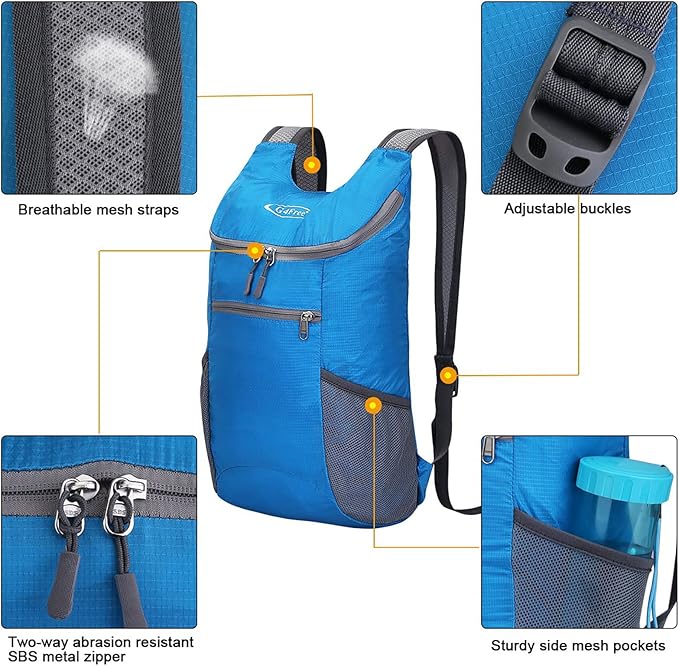 - Keep Things Organized: Foldable hiking backpack has two zippered compartments. The main pocket is large enough to carry travel essentials you need on the trip. The other pocket is great for quick access to items such as cash, credit cards, and passport. Two large sides mesh pockets for water bottles or umbrella