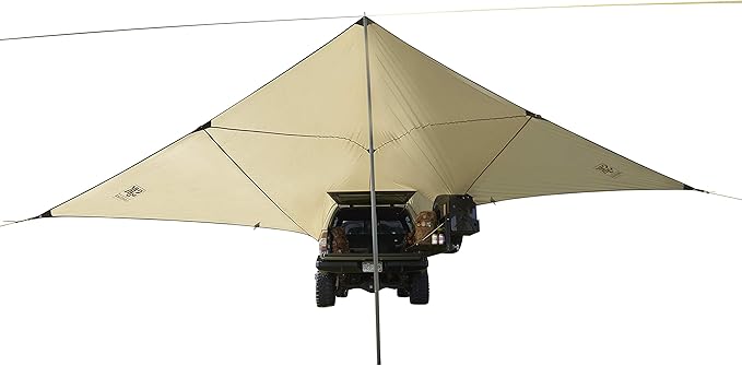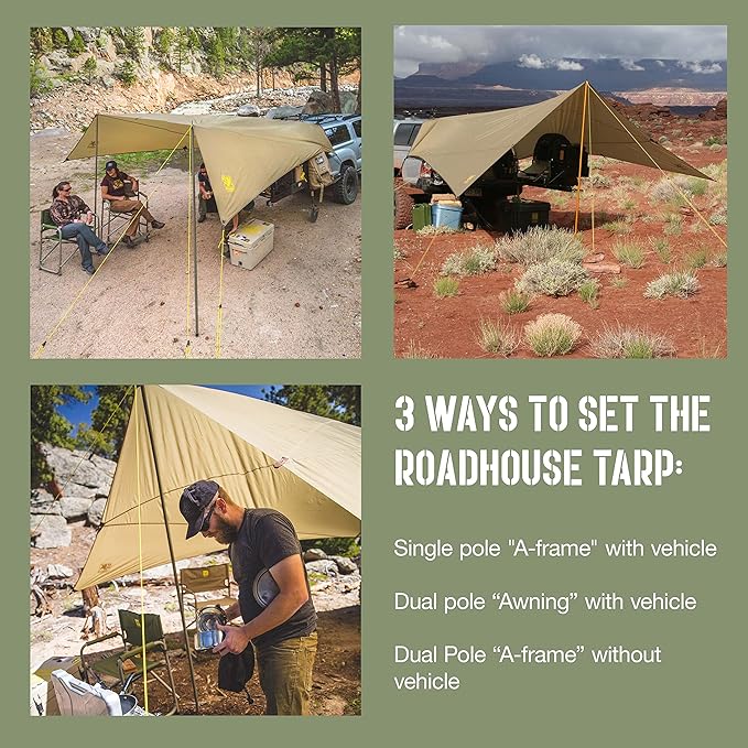 - VERSATILE: 3 Options for Tarp Set Up Include - Option 1/3: Single pole "A-frame" set up with vehicle. Option 2/3: Dual pole "awning" set up with vehicle. Option 3/3: Dual pole "A-frame" without vehicle.