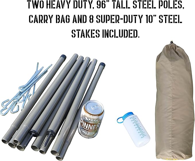 - INCLUDES: Two heavy duty, 96" tall steel poles, carry bag and 8 super-duty 10" steel stakes.
