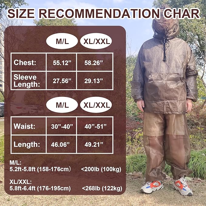 - One-piece design, full face hood. Elasticized drawstring waist and cuffs. Super light and soft, easy for carrying in the pocket. A must have item for fishing, hiking, hunting and most outdoor activities.