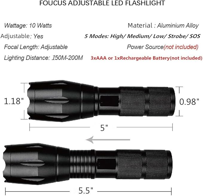 - Super Bright with 5 Modes - Powerful high Lumen LED generates a brilliant large area floodlight or a perfectly focused spotlight over a beam distance of 656ft/200m. Adjustable focus with 5 modes: (High, Medium, Low, Strobe, SOS/Emergency).