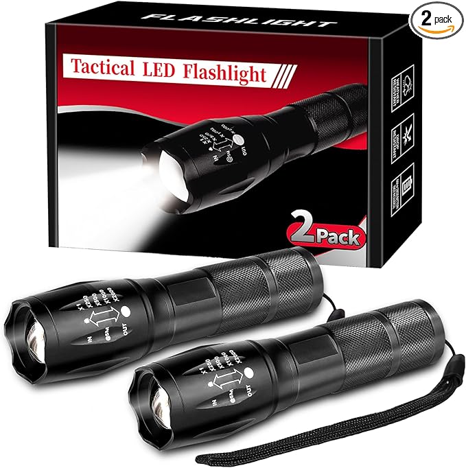 2 Pack Tactical Flashlights Torch, Military Grade 5 Modes 3000 High Lumens Led Waterproof Handheld Flashlight for Camping Biking Hiking Outdoor Home Emergency