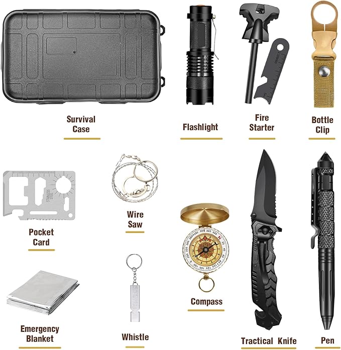- 13 in 1 Emergency Survival Kit Contains: Our professional survival kits includes: compass, wire saw, water bottle clip, emergency blanket, flint stone, survival tool, flashlight, whistle, mini light and a black waterproof box