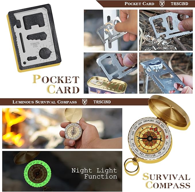 - High-quality equipment set: Our emergency equipment set includes a tactical flashlight, tactical pen, and compass, crafted from durable, high-quality materials for safety and longevity. Enjoy robust adventure experiences in camping and mountain climbing