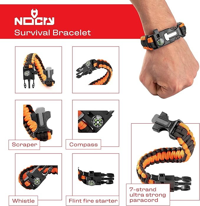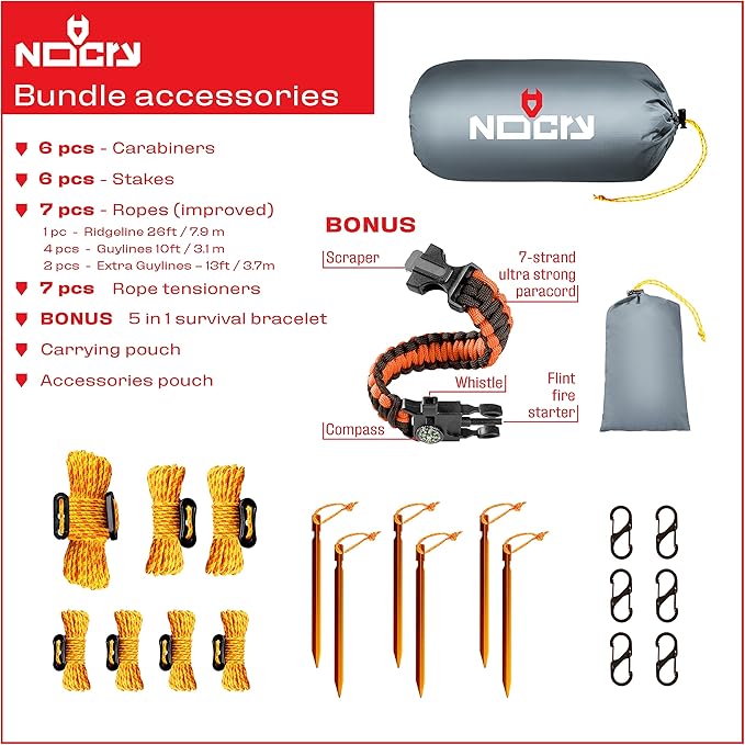 - THE GEAR YOU NEED IN ONE PLACE. Comes with 1 rainfly tarp, 6 aluminium stakes with orange reflective paracord ties, 6 carabiners, 7 adjustable ropes, 1 sack for the ropes and poles and 1 carrying pouch for all your gear. Just pack them together and put them in your bag. And, as a bonus, we’ve added a survival bracelet too!