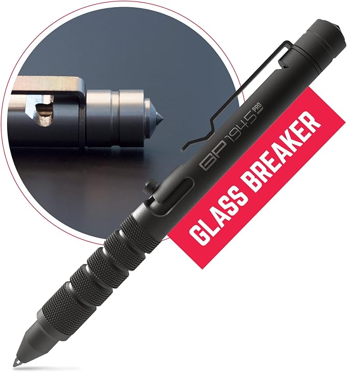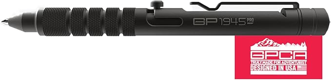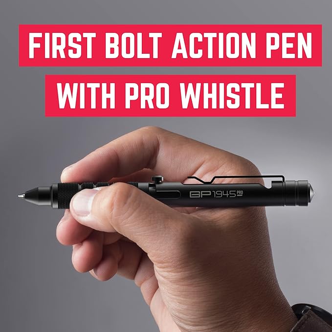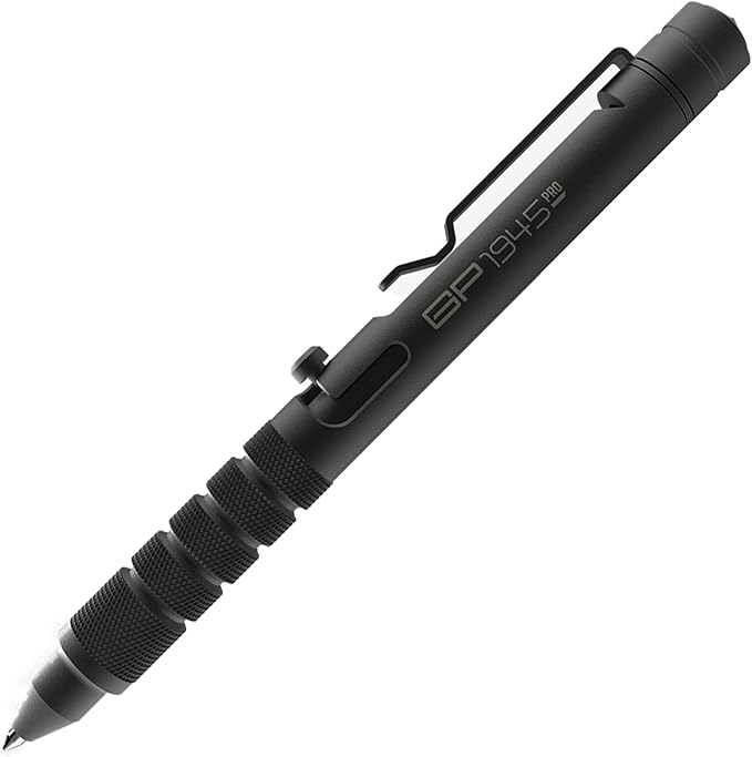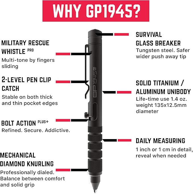 GPCA - GP 1945 Bolt Action Pen PRO, EDC Pen Multitool with Rescue Whistle, Survival Gear for Camping and Roadtrip, Measurement on grip, Aluminum, Jet Black