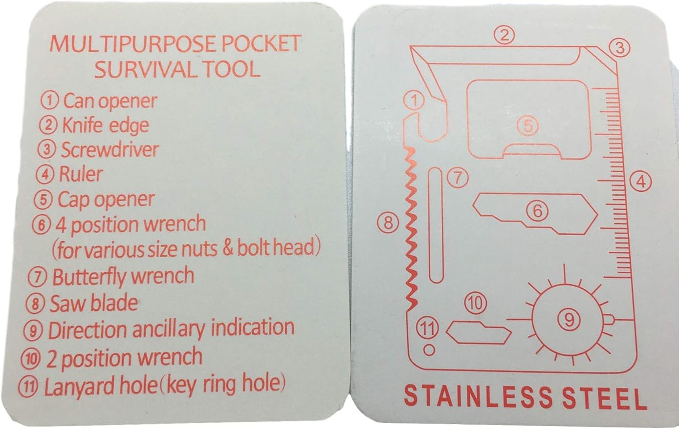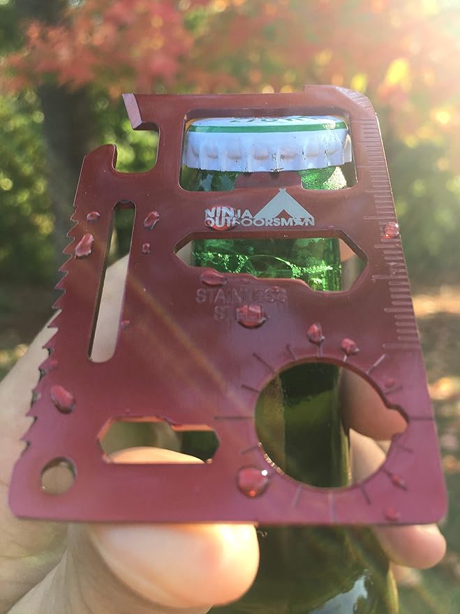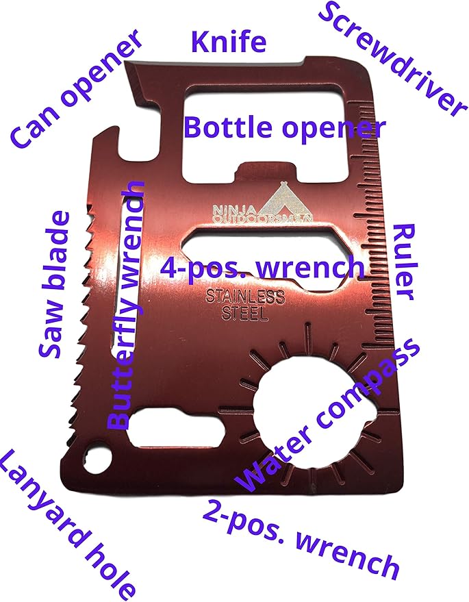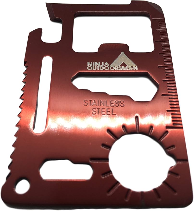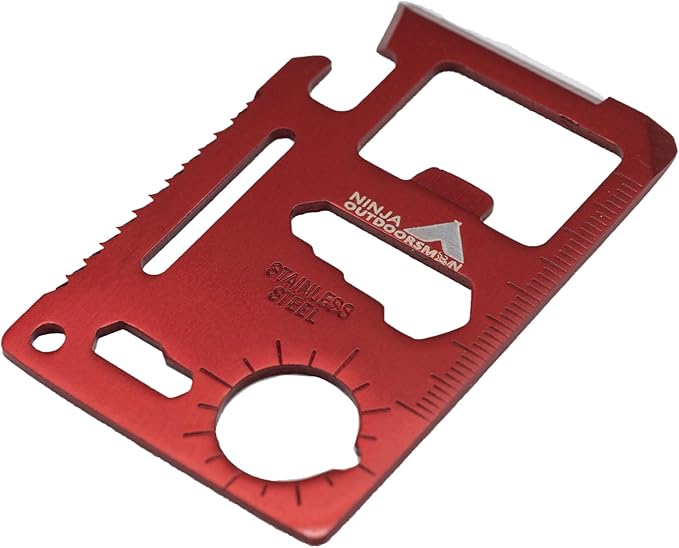 (10 Pack, Red) Ninja Outdoorsman 11 in 1 Stainless Steel Credit Card Pocket Sized Survival Multi Functional Tool - Stocking Stuffers, Christmas Gifts Under 10 Dollars
