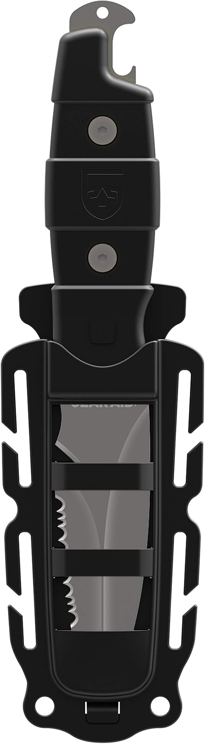 - Easily access the fixed blade knife with the quick release sheath, simply press the thumb tab and pull