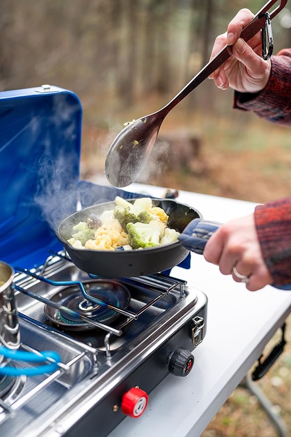 Love the lightweight design of this camping stove. It’s perfect for backpacking and cooks food quickly and evenly.