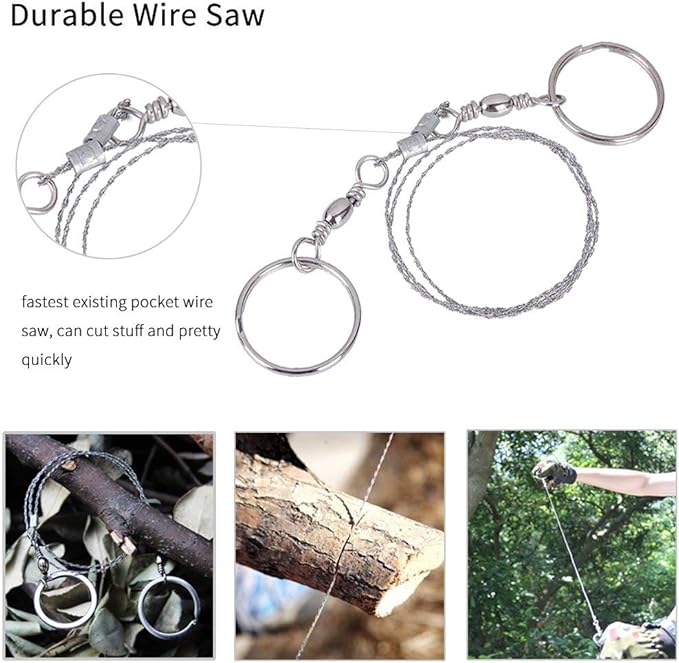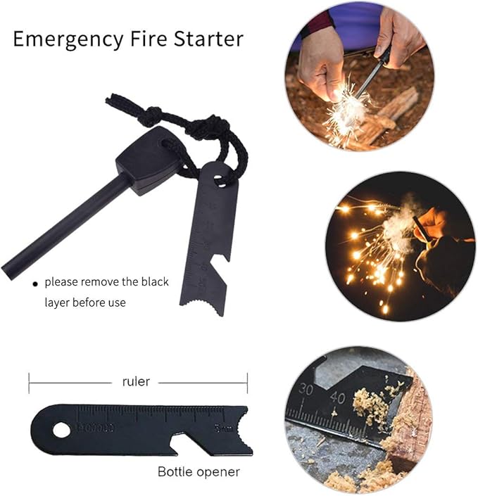 - [SURVIVAL TOOL]Stainless Steel Versatile Tool Card, Fire Starter, Compass, Emergency Whistle, Wire saw, Emergency Blanket. Which can Meet Your Different Needs! but also includes tactical preparedness survival tools for outdoor wilderness adventures activities like camping, boy scouts, hiking, fishing, hunting, backpacking, sports, boating or mountain biking.