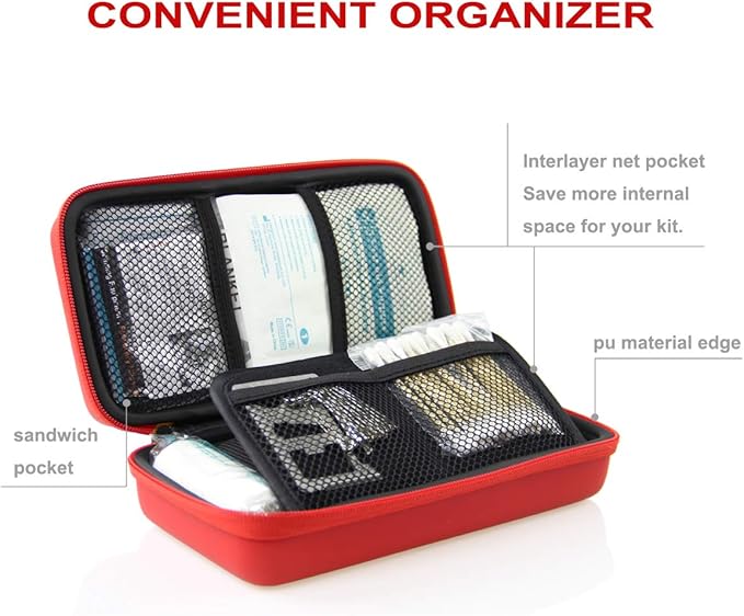 - [STRONG AND DURABLE] Compact High-end first aid kit (8.26"×4.7"×2.8"). Using EVA mold case that is Lightweight(1.2 pounds)and not easily deformed. The PU surface is smooth, waterproof and easy to clean with Waterproof. Eva lives longer than a nylon pack, and you can safely use it for many years.