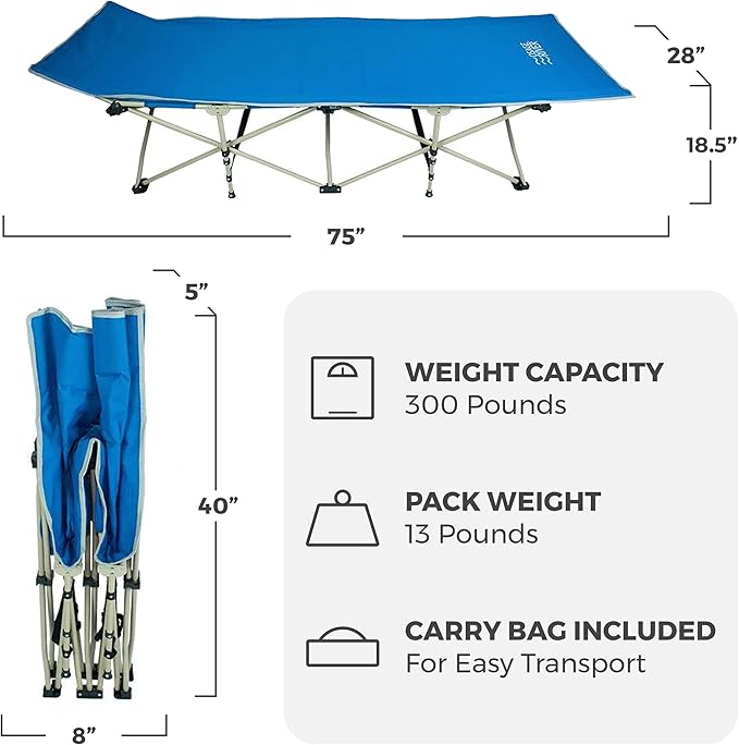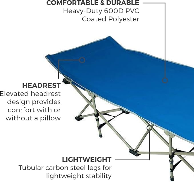 - ULTRA COMFORTABLE - The open sleeping cot dimensions are 28 inches wide, 75 inches long, and 18.5 inches high so you can sleep comfortably on your side or back; an elevated headrest ensures comfort with or without a pillow.