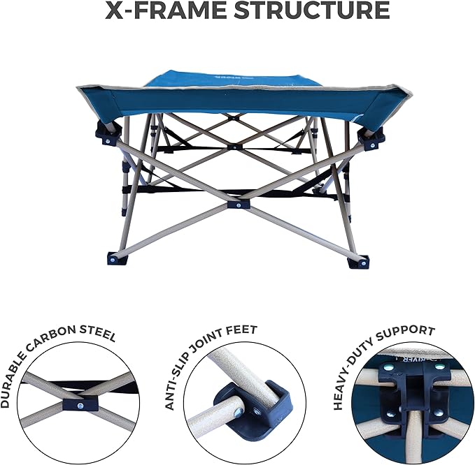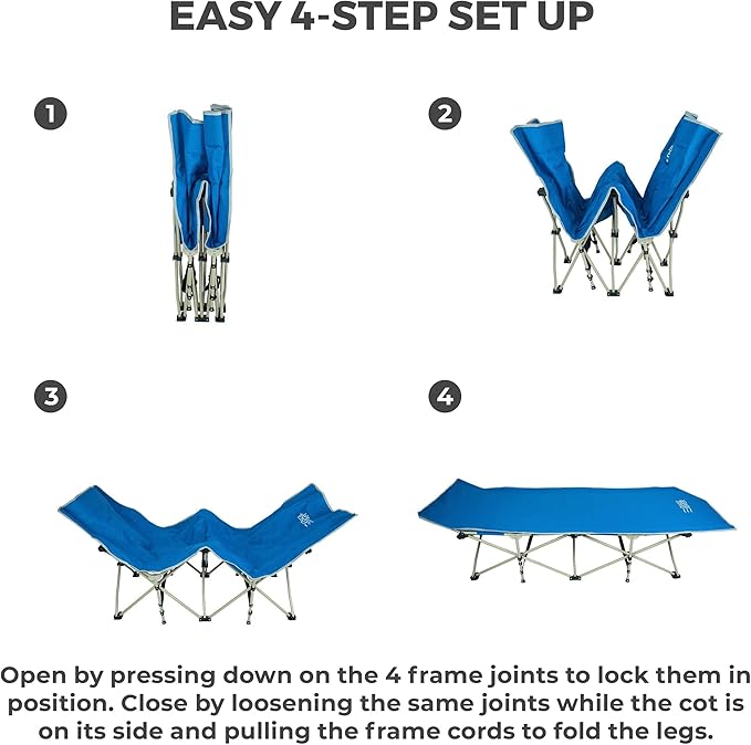 - EASY to SET UP and CARRY - Easy to use sleeping cots for adults; open by pressing down on the 4 frame joints to lock them in position; close by loosening the same joints while the cot is on its side and pulling the frame cords to fold the legs.