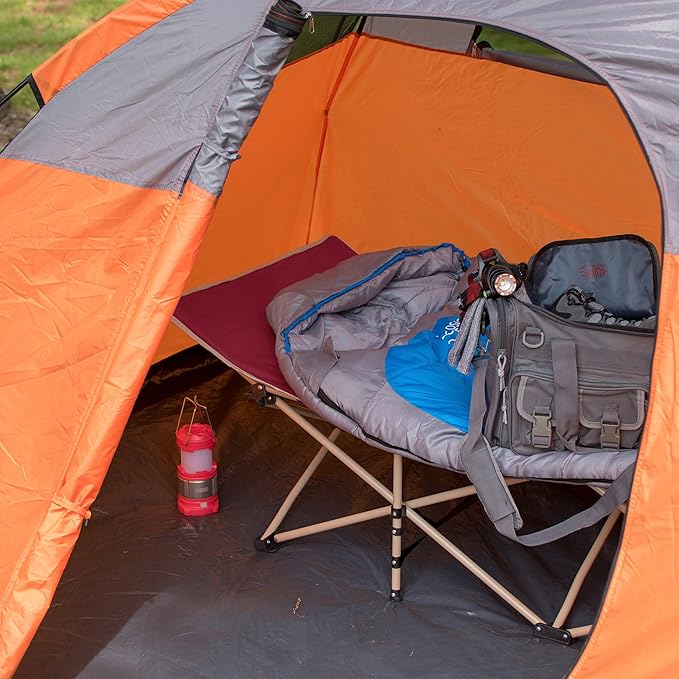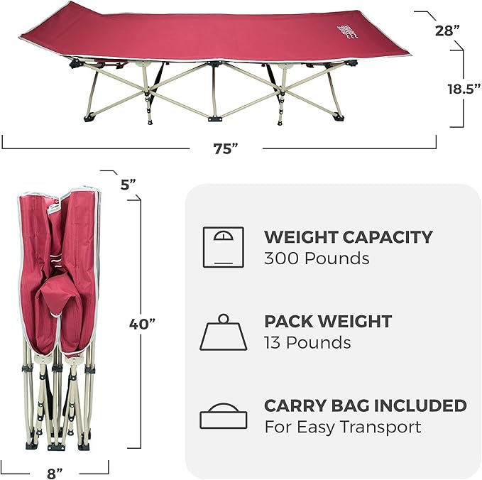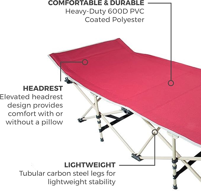 - ULTRA COMFORTABLE - The open sleeping cot dimensions are 28 inches wide, 75 inches long, and 18.5 inches high so you can sleep comfortably on your side or back; an elevated headrest ensures comfort with or without a pillow.