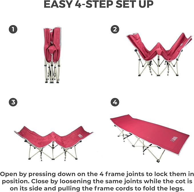 - EASY to SET UP and CARRY - Easy to use sleeping cots for adults; open by pressing down on the 4 frame joints to lock them in position; close by loosening the same joints while the cot is on its side and pulling the frame cords to fold the legs.