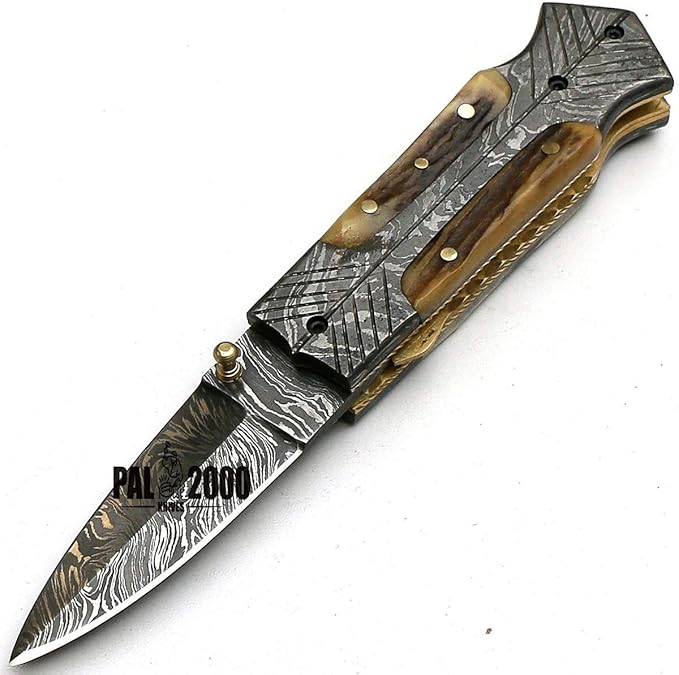 PAL 2000 KNIVES FOL-8897 Handmade Damascus Steel Blade Folding Pocket Hunting Knife with Sheath