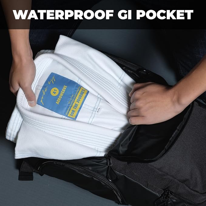 - Waterproof Gi Pocket: Keep your clean clothes clean, and your sweaty gear separate. Easily pack a dirty gi or rashguard in our backpack's waterproof pocket to keep your gear stink-free!